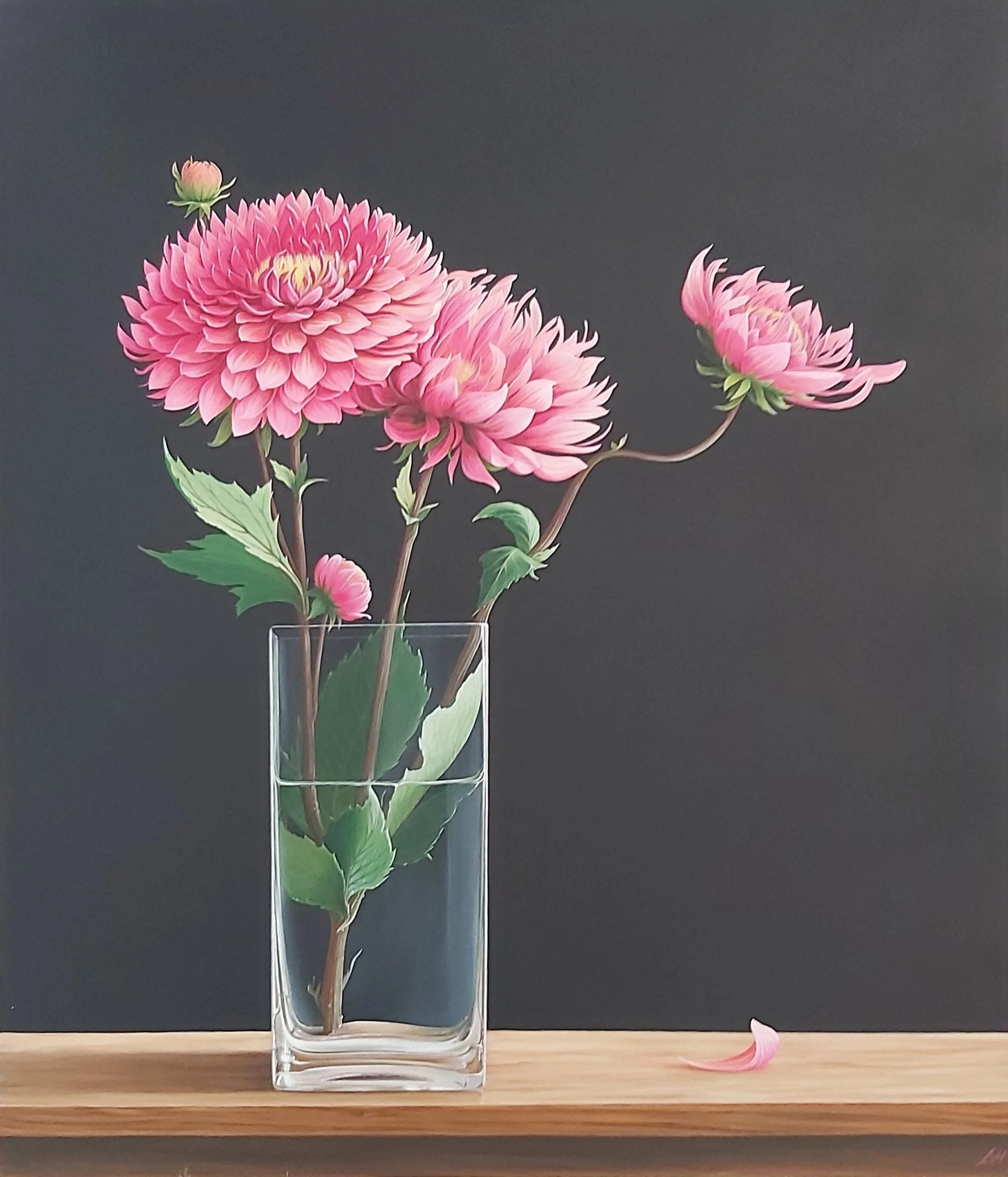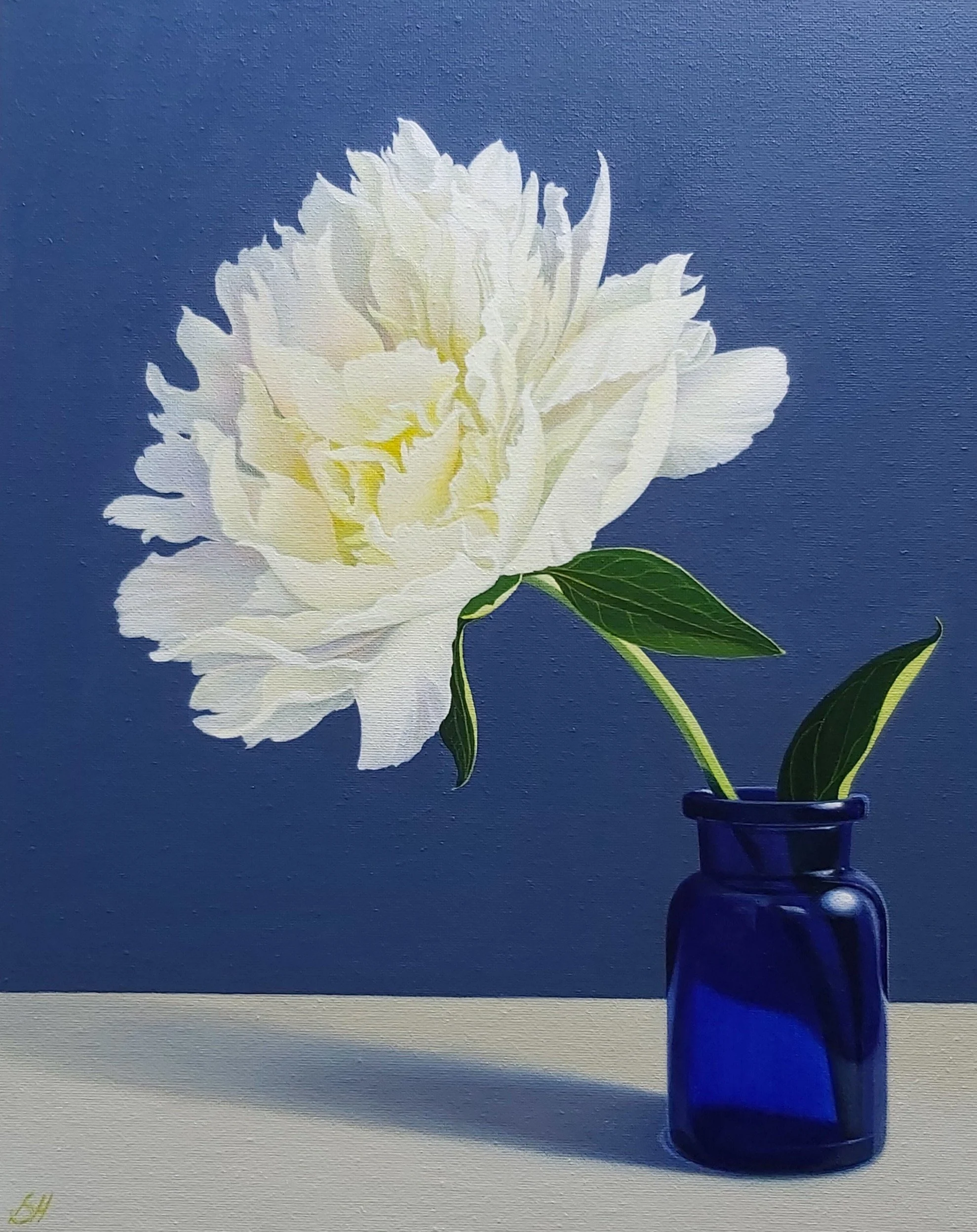 Sarah uses still life to explore the beauty and diversity in simple objects, natural forms, flowers, and water. Her eye is drawn to the play of light through glass or petals, upon fabric or glossy surfaces. She is intrigued by texture and the contrasts that can be created by placing different objects and materials next to each other.